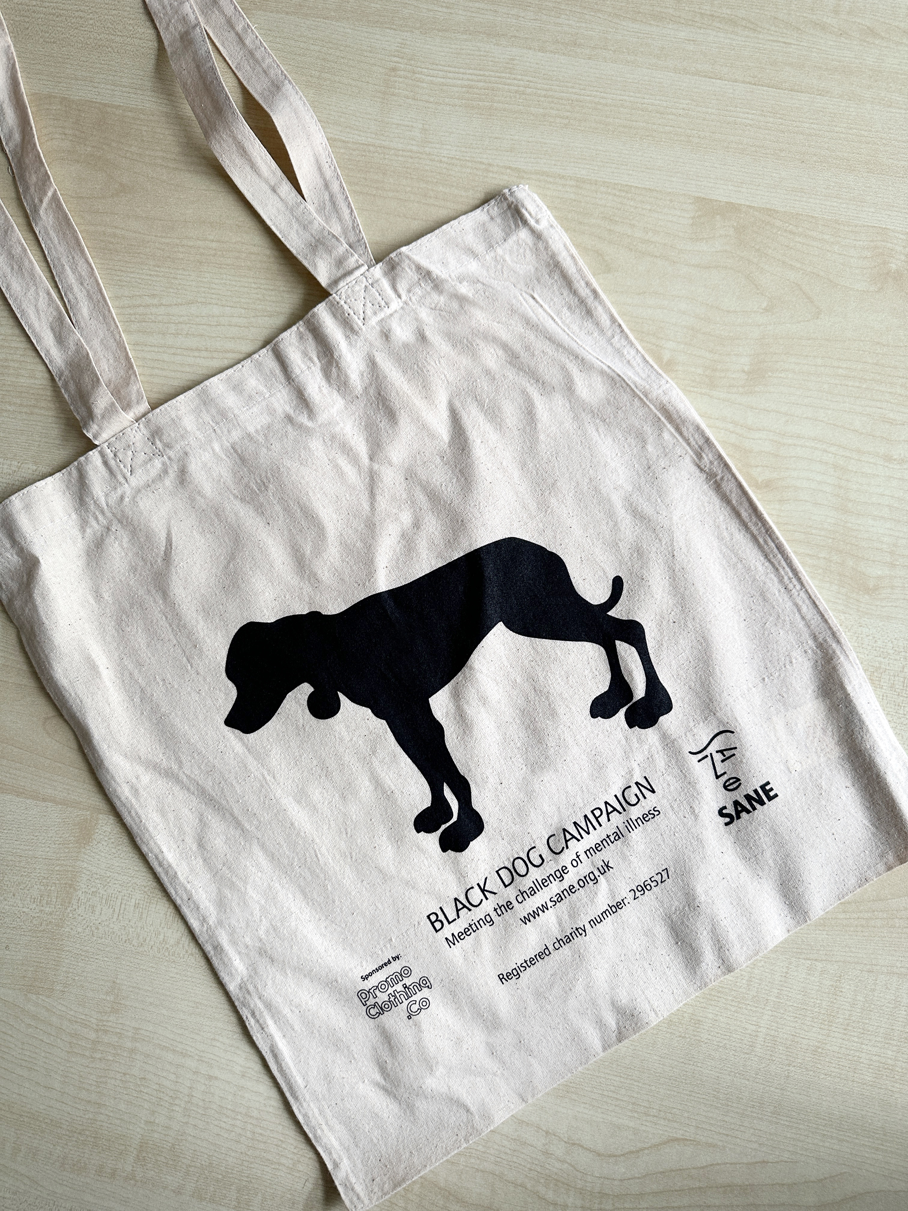 An exclusive tote bag featuring SANE’s Black Dog Campaign made of 100% cotton.